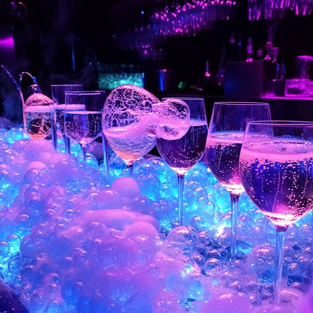Создано на основе запроса: Molecular mixology showcase: cocktails with bubbles, foams, and unusual textures under dramatic blue-pink lights