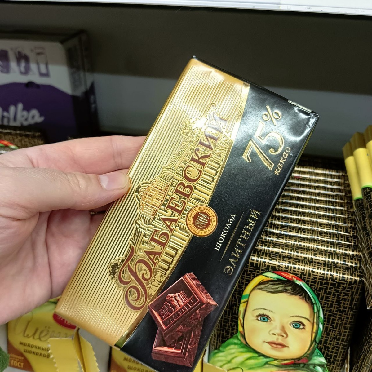 Это не реклама Чижика,просто если Вы любите Бабаевский горький шоколад 75% покупайте в Чижике.Во первых дешевле - 124 р. против 149.99р. И вес 90 г против 75 г.