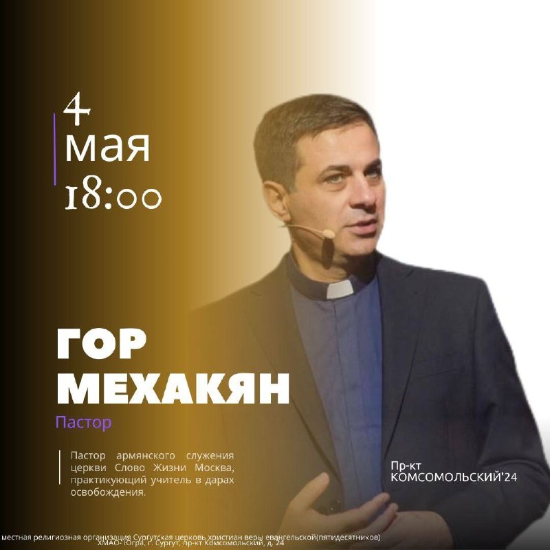 Добро пожаловать на служение с Гором Мехакяном! Человек, который движим дарами Духа Святого! 📅 04.05.2025 🟡18:00 📍Сургут, пр-т Комсомольский 24 📎 Обязательно приглашайте друзей и родных, а так же делитесь приглашениям в соц.сетях! ✝️присоединяйтесь к нам онлайн RUTUBE https://rutube.ru/channel/41683559/