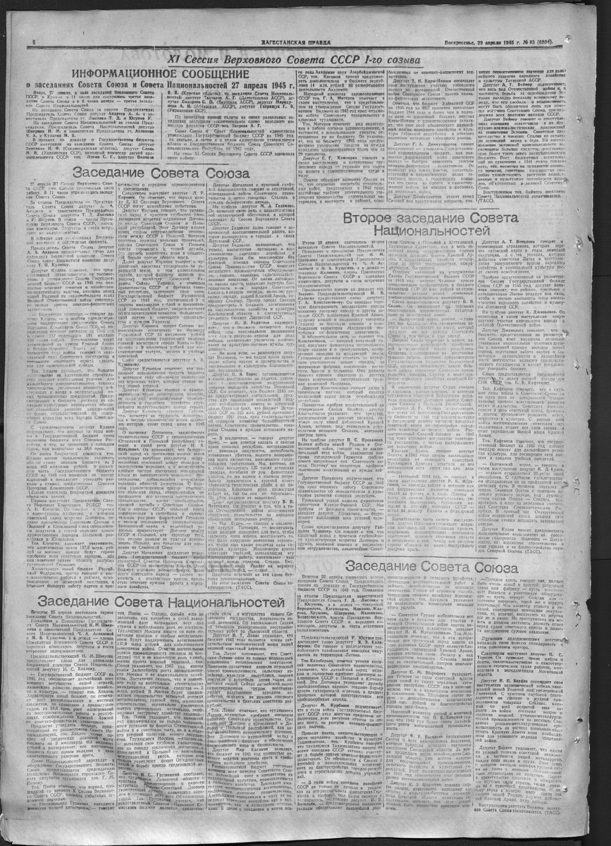 Обзор заседания Совета Национальностей 27 апреля 1945 года состоялись заседания Совета Союза и Совета Национальностей Верховного Совета СССР в Кремле. На заседаниях обсуждался Государственный бюджет СССР на 1945 год. После прений депутаты, включая Зименкова, Слоня, Лукина, Волчкова, Тахтарова, Сидорова, Мирхудавала и Гаврищука, заслушали заключительное слово народного комиссара финансов СССР Зверева. Совет Союза и Совет Национальностей единогласно утвердили Государственный бюджет СССР на 1945 год по статьям, а затем и в целом. На этом XI Сессия Верховного Совета СССР закончила свою работу. Заседание Совета Национальностей, состоявшееся 25 апреля, было посвящено обсуждению государственного бюджета СССР на 1945 год. Основной докладчик Хохлов указал на рост экономики и культуры, а также на необходимость восстановления разрушенных регионов. Попов отметил успехи Москвы в строительстве и промышленности, а Лацис подчеркнул важность восстановления Латвии после немецкой оккупации. Обсуждались т