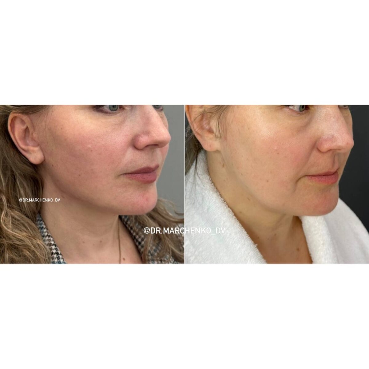 Отёчность и покраснение ещё сохраняются — это абсолютно нормальный этап восстановления, ведь кожа и ткани продолжают адаптироваться. Но даже сейчас уже отчётливо видно, насколько улучшился овал лица, подтянулась нижняя треть.