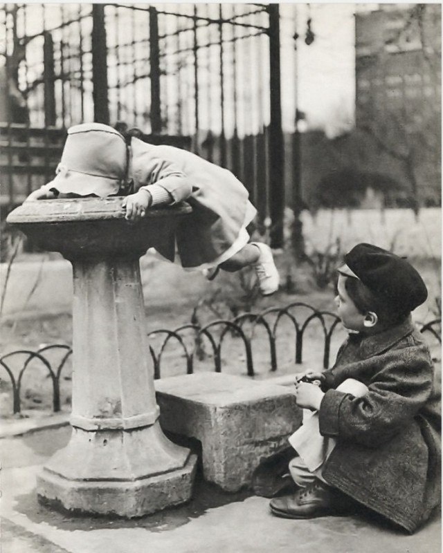 На снимке — крохотная девочка, почти целиком залезшая на каменный питьевой фонтанчик в попытке достать до воды. Её широкополая шляпа почти полностью скрывает лицо, ручки крепко держатся за край чаши, а ножки комично болтаются в воздухе. На скамейке рядом сидит мальчик — чуть постарше, в пальто и берете, с заворожённым выражением лица. Он следит за ней, будто за каскадёром, готовым сорваться в любой момент. Ни страха, ни суеты — только детская сосредоточенность и неподдельный интерес.