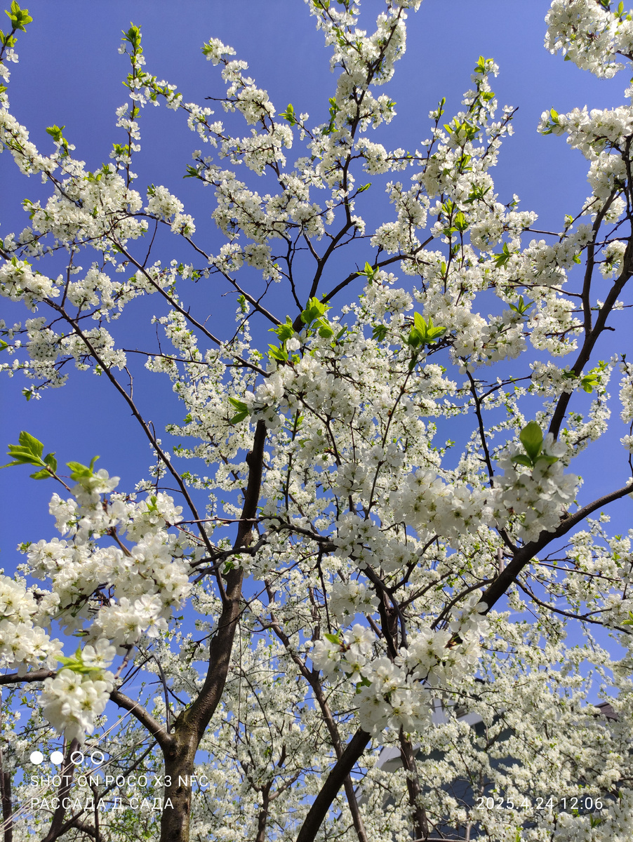 Всё в цвету - черешни, вишни, сливы, абрикосы, смородина. Даже груша молоденькая зацвела.