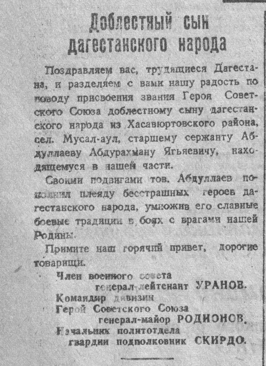 Поздравляем вас, трудящиеся Дагестана, и разделяем с вами нашу радость по поводу присвоения звания Героя Советского Союза доблестному сыну дагестанского народа из Хасавюртовского района, сел. Мусал-аул, старшему сержанту Абдуллаеву Абдурахману Ягьяевичу, находящемуся в нашей части.