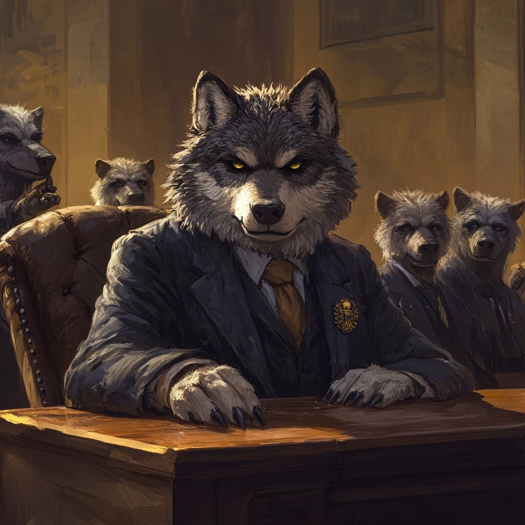 Создано на основе запроса: make a wolf as italian mobster being judged in a courtroom of a hyenas as jury