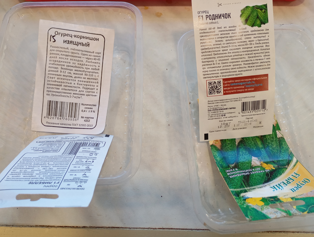 Беру прозрачные контейнеры. Замачивать буду четыре сорта огурца. Два сорта проверенные временем Изящные и Либелле и два новых для меня сорта не требующих опыления.