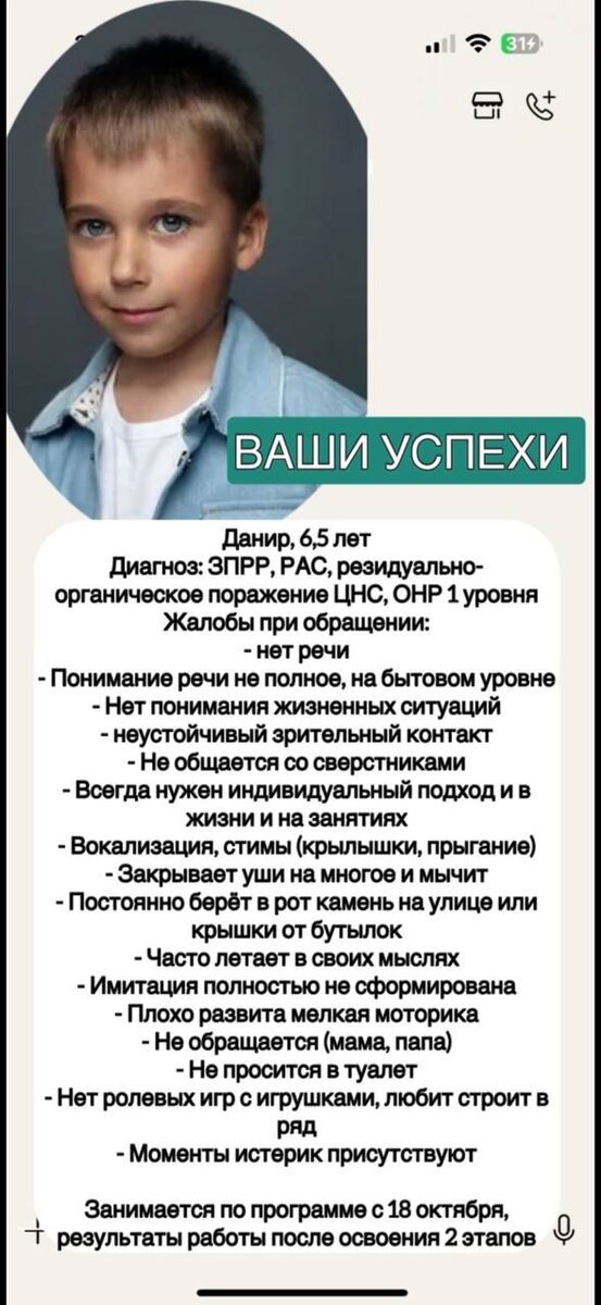Продолжаю историю Данира, 6,5 лет Начало тут Диагноз: ЗПРР, РАС, резидуально-органическое поражение ЦНС, ОНР 1 уровня Жалобы при обращении: - нет речи - Понимание речи не полное, на бытовом уровне - Нет понимания жизненных ситуаций - неустойчивый зрительный контакт - Не общается со сверстниками - Всегда нужен индивидуальный подход и в жизни и на занятиях - Вокализация, стимы (крылышки, прыгание) - Закрывает уши на многое и мычит - Постоянно берёт в рот камень на улице или крышки от бутылок - Часто летает в своих мыслях - Имитация полностью не сформирована - Плохо развита мелкая моторика - Не обращается (мама, папа) - Не просится в туалет - Нет ролевых игр с игрушками, любит строит в ряд - Моменты истерик присутствуют Занимается по программе с 18 октября, результаты работы после освоения 2 этапов Записаться на сопровождение или на мой онлайн-курс,можно у ассистента ➡️ https://t.me/Assistent_Gudzenko_A #методикагудзенко_отзывы #методикагудзенко #аутизм #аутизмпобедим #аутизмнеприго