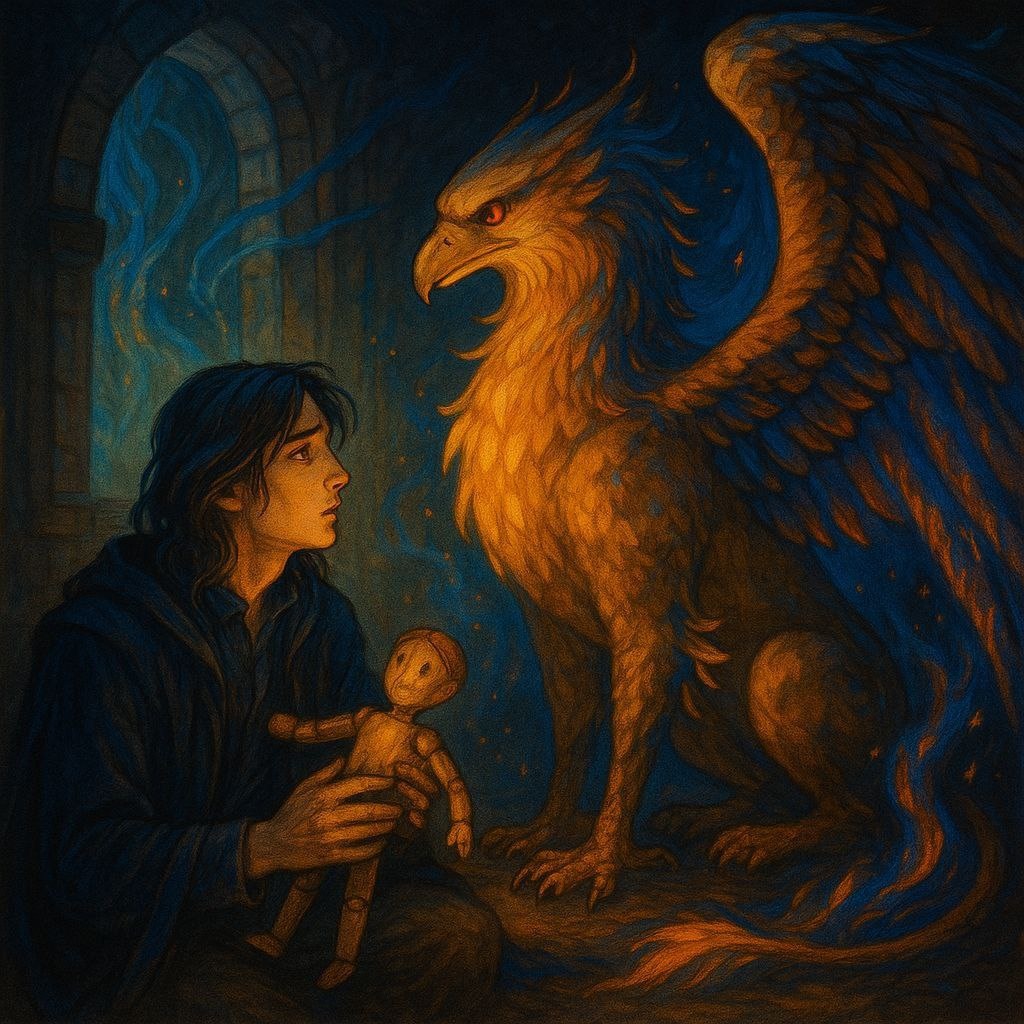 Сказка «Падение златопёрого» Жил-был в высоких небесах, над мирами, которые люди видели только во снах, юный грифон с огненными крыльями. Его звали Люцио Златоперо, и он хранил Звёздную Тропу — дорогу, по которой в мир детей приходят мечты. Он был юн и полон пламени, но никогда не спускался к людям. Это было запрещено. Он знал о них только из рассказов матери — Ольмиры, огненной хранительницы, чьи сказки согревали даже лёд в душах. Но однажды он услышал плач. Сквозь слои облаков, сквозь завесу снов до него донёсся голос мальчика: "Если чудо не придёт — я больше не проснусь". Это было настоящее горе. Оно пронзило сердце Люцио, как стрела. Он посмотрел на Землю. Он не имел права. Но не мог остаться. Он сорвался вниз. Путь Падения: Чтобы ступить в мир людей, нужно оставить часть себя. Люцио спустился в Сердце Забытого Леса — туда, где дремали Сны, которые никто не вспомнит. Там он обменял перо памяти на человеческий облик. — Ты забудешь, как быть небесным, — прошептало древо. — Н