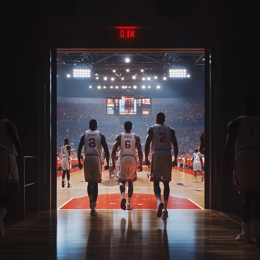 Создано на основе запроса: hyper realism image of pro basketball players approaching the court from the locker room
