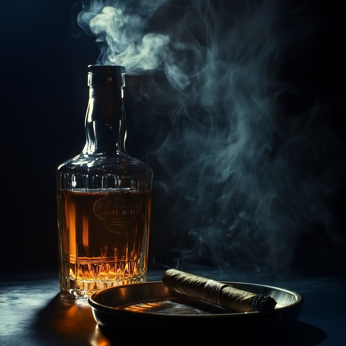 Создано на основе запроса: A bottle of single malt whiskey with glass and burning cigar in a metal ashtray, soft shadows and elegant