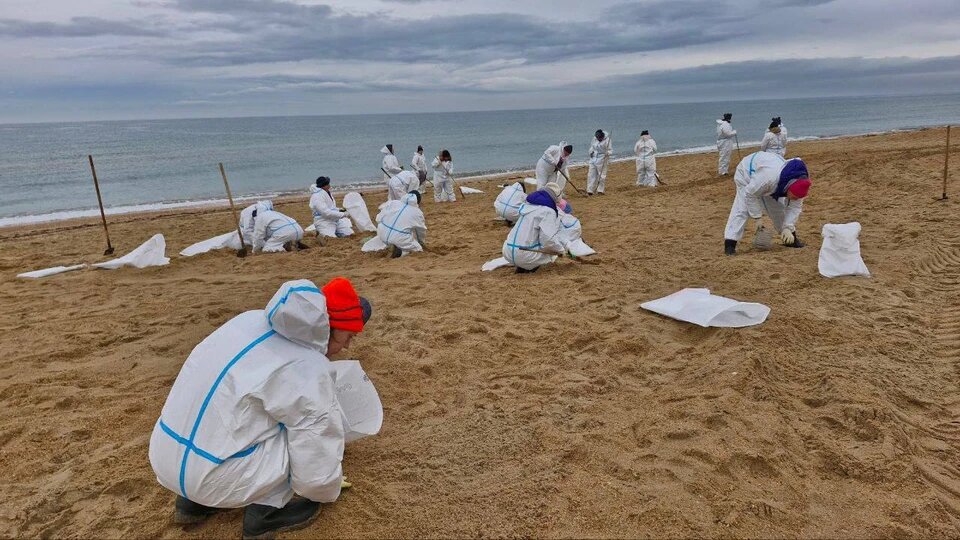 Установка с поверхностно-активными веществами и горячей водой отделяет мазут. После сушки песок возвращают на берег.