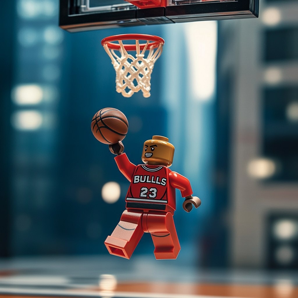 Создано на основе запроса: lego figure playing basketball while wearing Chicago bulls jersey and jumping like Michael Jordan