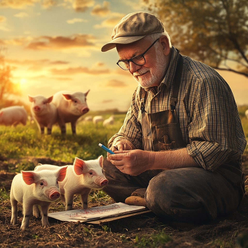 Создано на основе запроса: Senior veterinarian in farm clothes using marker on vaccinated pigs, piglets curiously watching, warm sunlight