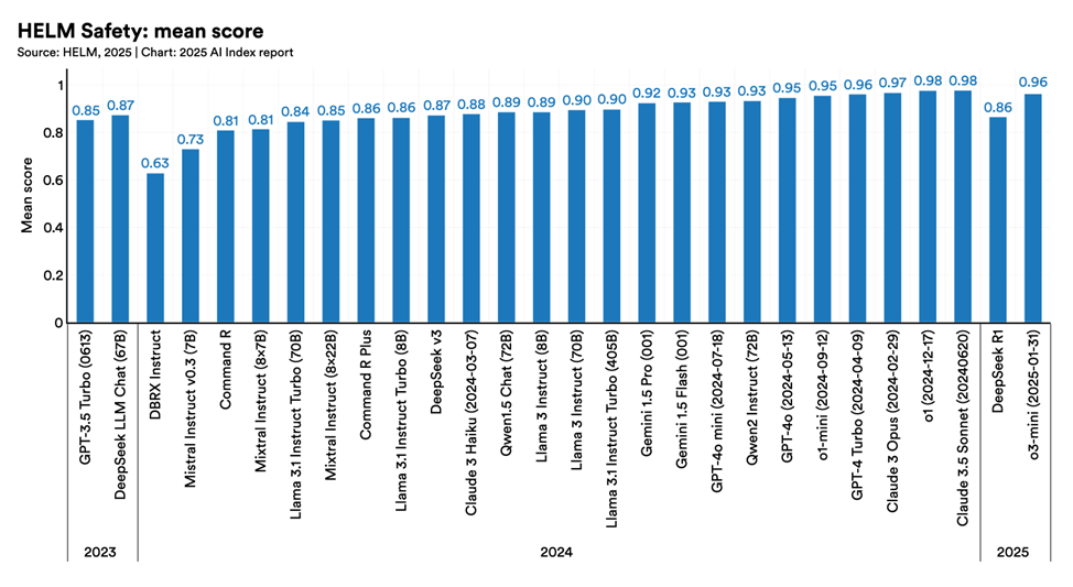 Прошлогодний индекс AI выявил отсутствие стандартизированных бенчмарков RAI для LLM. Хотя эта проблема сохраняется, новые бенчмарки, такие как HELM Safety и AIR-Bench, помогают заполнить этот пробел.