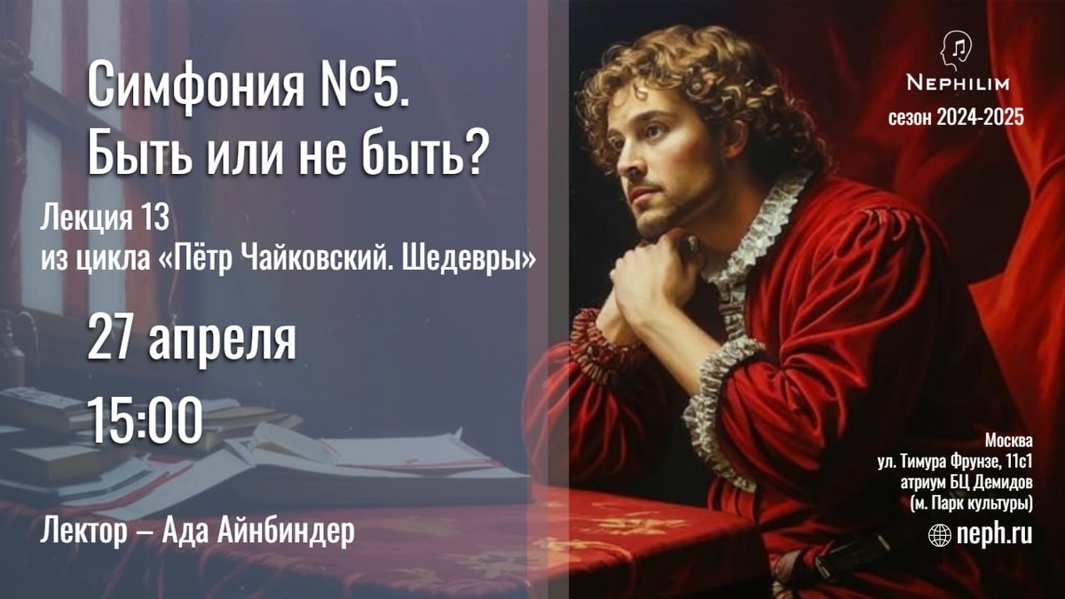 Уже в воскресенье новую лекцию из цикла «Пётр Чайковский. Шедевры» прочитает музыковед Ада Айнбиндер – один из ведущих исследователей наследия Чайковского, автор биографии композитора в серии ЖЗЛ. О чём рассказывает его искусство? Какие тайны скрыты в его самых известных сочинениях? 🗓27 апреля 15:00 Симфония №5. Быть или не быть? Буду теперь усиленно работать, мне ужасно хочется доказать не только другим, но и самому себе, что я еще не выдохся. Частенько находит на меня сомнение в себе и является вопрос: не пора ли остановиться, не слишком ли я напрягал всегда свою фантазию, не иссяк ли источник? Ведь когда-нибудь должно же это случиться, если мне суждено еще десяток-другой лет прожить, и почему не знать, что не пришло уже время слагать оружие? 🟡Как связаны одно из самых известных оркестровых произведений Чайковского и Шекспировский «Гамлет»? 🟡Почему Чайковский написал пятую симфонию только спустя 11 лет после премьеры четвёртой и что происходило в эти годы в его жизни? 🟡Как