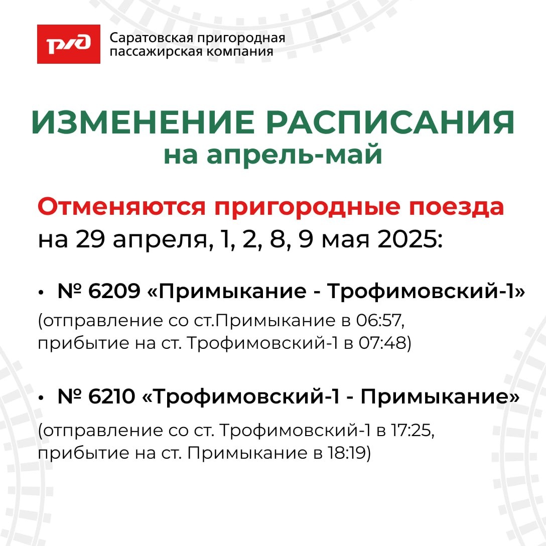 📣 Уважаемые Пассажиры 📣 Изменяется расписание пригородных поездов на конец апреля и начало мая. Краткую информацию об изменениях мы подготовили для Вас в информационных карточках. Просим заблаговременно ознакомиться с новым расписанием и планировать свои поездки заранее. *** С подробной информацией о расписании движения пригородных поездов можно ознакомиться с помощью мобильных приложений «РЖД Пассажирам», «ПроТранспорт» и «Яндекс.Электрички», по телефону центра поддержки клиентов ОАО «РЖД» 8-800-775-00-00 (звонок бесплатный), на информационных стендах билетных касс, а также на сайте компании в разделе «Расписание» .