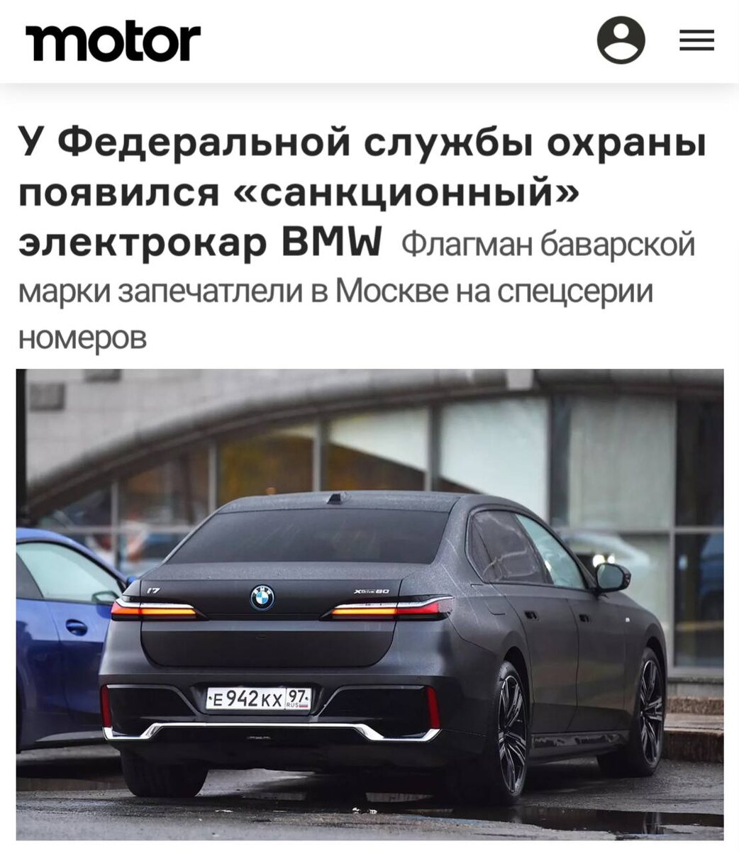 В Москве был замечен электрокар BMW i7 с особыми номерами, зарегистрированный для Федеральной службы охраны. Флагман BMW стоимостью более ₽18 миллионов официально не поставляется в Россию, однако для спецслужб закон допускает покупку любых авто. 🚙 @Maloycar