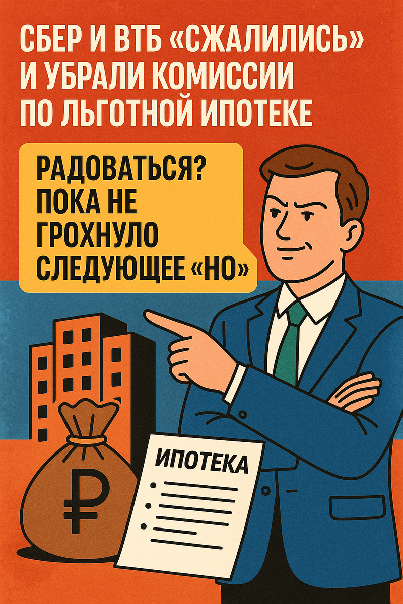Если вы ещё не слышали новость — поздравляем, вы либо очень заняты, либо живёте в пещере с плохим Wi-Fi. Сбер и ВТБ, два ипотечных кита на стероидах, вдруг осознали, что брать с людей по 200–300 тысяч рублей “комиссии” за льготную ипотеку — это как-то, знаете ли, некрасиво. И что вы думаете? Комиссии “добровольно” отменили. Без давления. Почти.