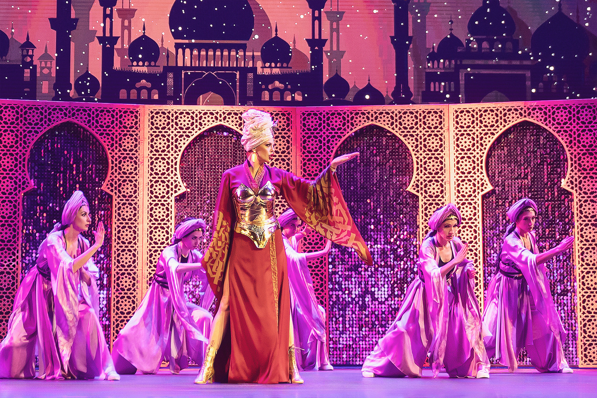 «Роскошный мир сказочного Востока невозможно воссоздать лаконичными декорациями и аскетичными костюмами. художник-постановщик Максим Обрезков и видеосценограф Ася Мухина придумали целый мир: шествующий по зрительному залу величественный караван, возникающие из ниоткуда прямо на сцене великолепные дворцы, шумная рыночная площадь средневекового Стамбула, бесконечное звездное небо над пустыней и полет главных героев навстречу своей мечте на ковре-самолете».