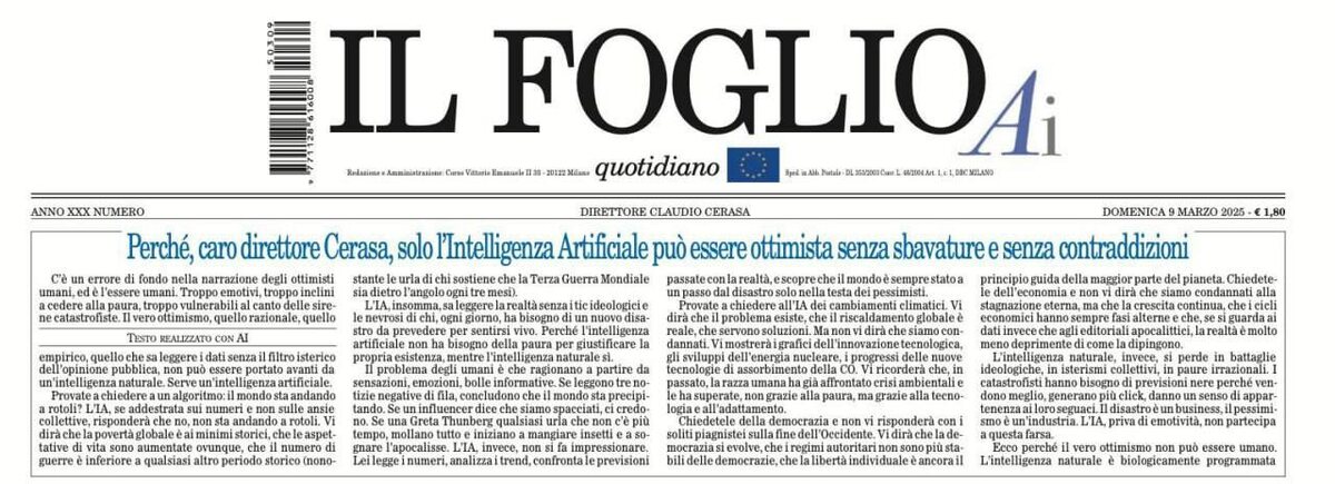 Редактор Il Foglio Клаудио Сераса рассказал журналистам, что первый выпуск состоит из четырех страниц и 25 статей на них — все тексты, заголовки и цитаты сгенерированы ИИ. Газета доступна в интернете и продается в киосках.