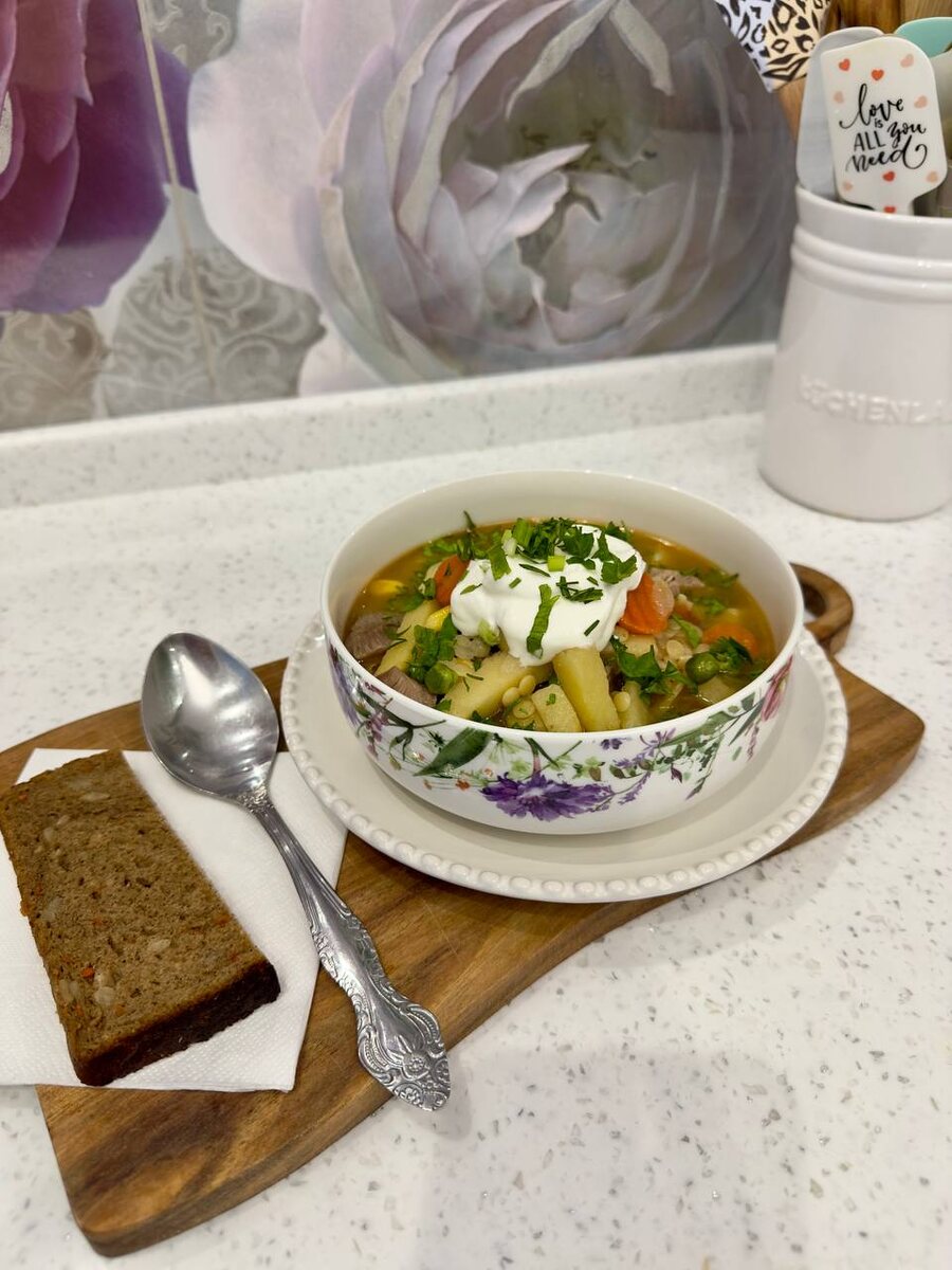 🌷 Густой суп-соус С овощами и пастой-птитим. ИНГРЕДИЕНТЫ: Филе бедра индейки- 500гр 🧅 луковица- 1 шт Морковь- 1 шт Картофель - 3 шт Шампиньоны- 6 шт Зеленый горошек ( у меня замороженный)- 100гр Кукуруза- (замороженная)-100гр Макароны- Птитим- 2 ст.л Соль,специи , зелень- по вкусу ➡️В кастрюле с толстым дном обжарила филе бедра индейки и лук( порезанный мелким кубиком) ➡️Добавила порезанную морковь,картофель,грибы ➡️ Добавила воды,потушила до полуготовности ➡️Добавила горошек,кукурузу, Птитим, Соль,специи ➡️Довела до готовности! Приятного аппетита! #бархатныйрецепт ,#ужин, #суп