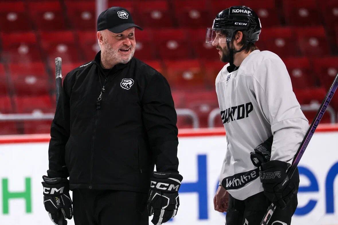 «Московское „Динамо“ — очень хороший соперник». 🚜 24 апреля в Челябинске прошла открытая тренировка «Трактора» перед полуфинальной серией Кубка Гагарина против московского «Динамо». На вопросы журналистов ответили главный тренер Бенуа Гру, нападающий Василий Глотов и защитник Логан Дэй. 🏆#КубокГагарина