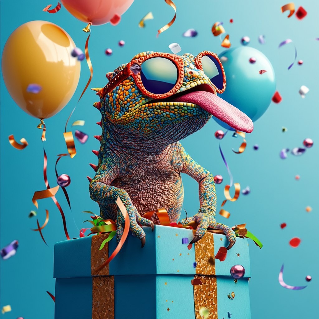 Создано на основе запроса: A playful chameleon with sunglasses, tongue out, perched on a gift box with balloons and streamers around it