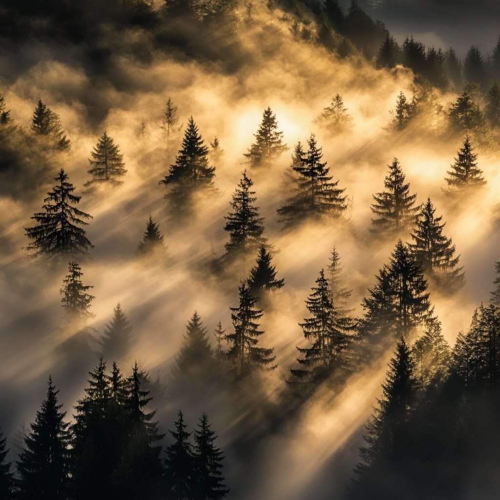 Создано на основе запроса: Thick fog swirling through the trees of the Black Forest at dawn, shadowy silhouettes and dark green foliage
