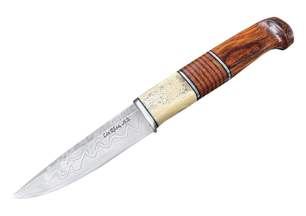 Если бы ножи умели рассказывать истории, Puukko от Лина Рея говорил бы на языке древних скандинавских саг. Этот ABS-мастер (да, тот самый гильдейский титул!) соединил традиционную финскую геометрию с роскошью дамасской стали. Клинок с односторонней заточкой — оммаж охотничьим ножам прошлого, а ножны от Джошуа Рея (его сына) из натуральной кожи с петлей для ремня превращают инструмент в аксессуар с душой. Для тех, кто ценит наследие, но не готов жертвовать эстетикой.
