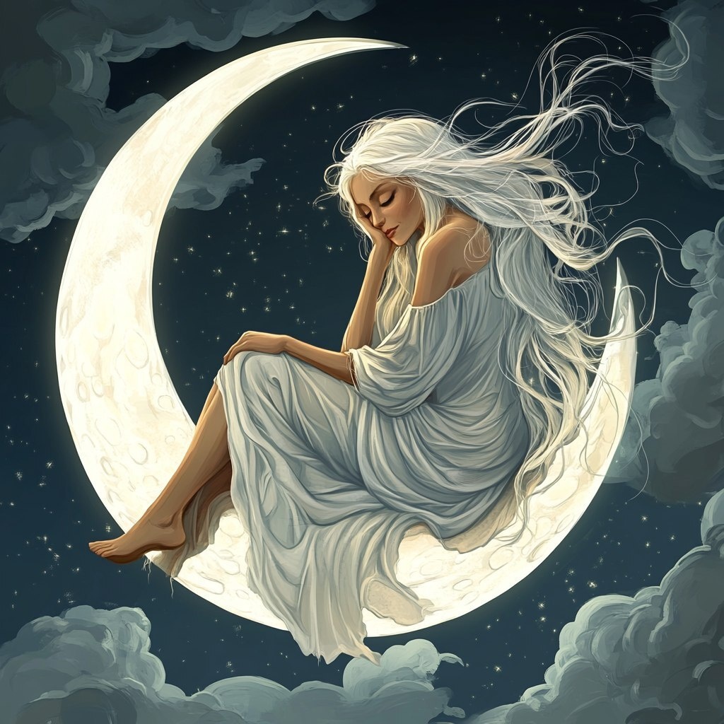 Создано на основе запроса: cartoonish, moonlike, beautiful middle aged woman, long white hair, gray eyes, gammer, sitting on sliver of the
