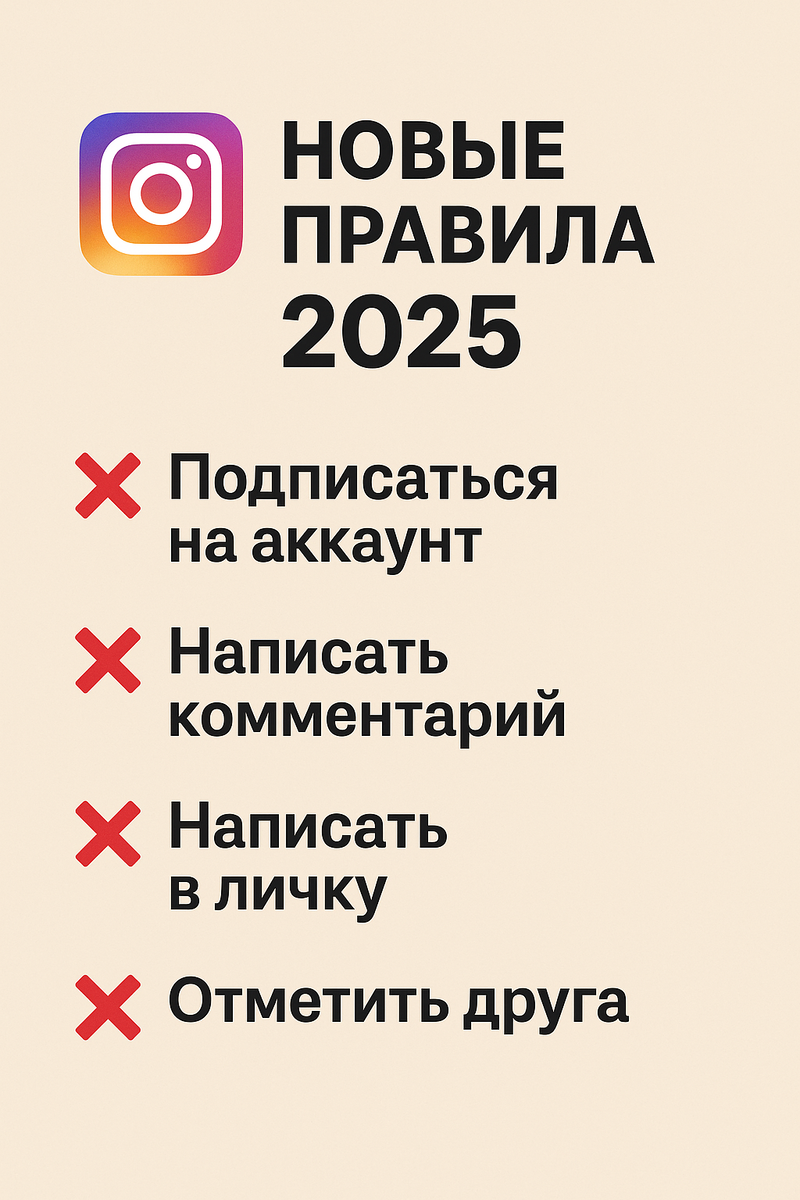 В 2025 году Instagram ужесточил правила в отношении контента, особенно в формате Reels. Цель этих изменений — борьба с манипулятивными практиками, спамом и неестественным вовлечением аудитории. Ниже представлены основные ограничения и рекомендации по их соблюдению. Запрещено использовать фразы, побуждающие к действиям, таким как: socialrex.com Такие призывы считаются манипулятивными и могут привести к снижению охвата или удалению контента. Могут восприняться как спам. Запрещено организовывать розыгрыши и конкурсы, требующие от участников выполнения определённых действий, таких как подписка, лайк или комментарий, для участия. Даже использование слов «розыгрыш» или «конкурс» может привести к блокировке контента. socialrex.com Использование автоматических сообщений, массовых комментариев или других автоматизированных методов взаимодействия без разрешения Instagram запрещено. Это включает в себя массовую рассылку одинаковых сообщений в директ или комментарии. socialrex.com Instagram
