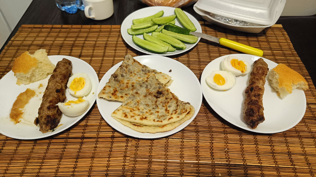 Позавтракали остатками люля-кебаб, яйцом и хычыном.