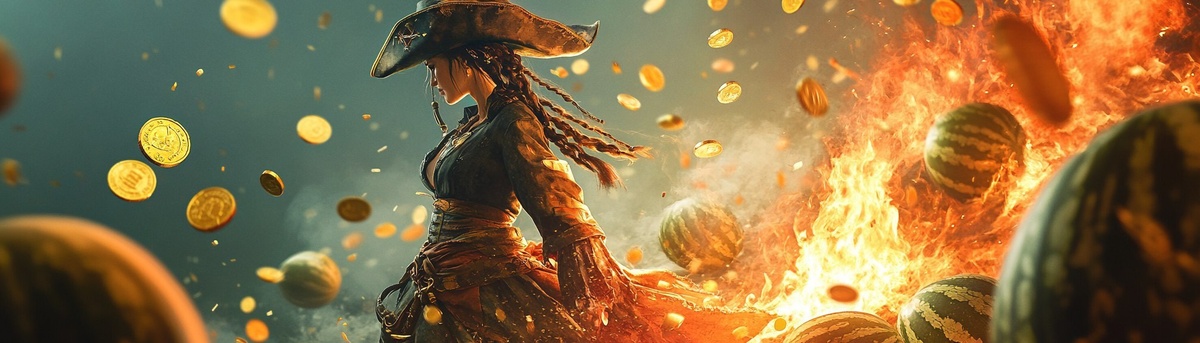 Создано на основе запроса: female pirate captain from waist to head, she is on a field full of water mellons, there is a fire and gold coins