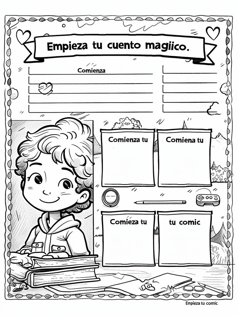 Создано на основе запроса: black and white coloring book page layout for children, no characters, top 1/3 of the page: title "Empieza tu cuento mágico" and four blank horizontal lines for writing; bottom 2/3 of the page: title "Comienza tu cómic" and three empty rectangular comic panels in a row, pixel-style border around the whole page, neutral icons like joystick, heart, book, headphones, suitable for boys and girls age 8-11, clean and minimalistic design, printable coloring page --- Автоперевод: Черно -белая раскраска для детей, без персонажей, топ 1/3 страницы: заголовок "Empieza Tu Cuento Mágico" и четыре чистые горизонтальные линии для написания; Классно получилось? 🤔 https://dzen.ru/id/65c0c65c86e4f837c27b24d7 #ИИ #AI #нейросеть #midjourney #art
