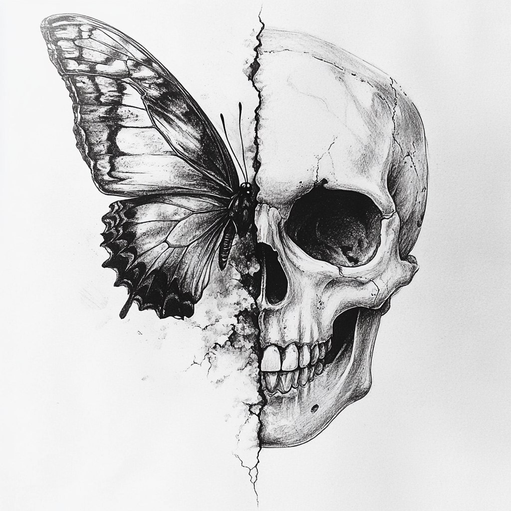 Создано на основе запроса: Create me a drawing half butterfly wing and half skull