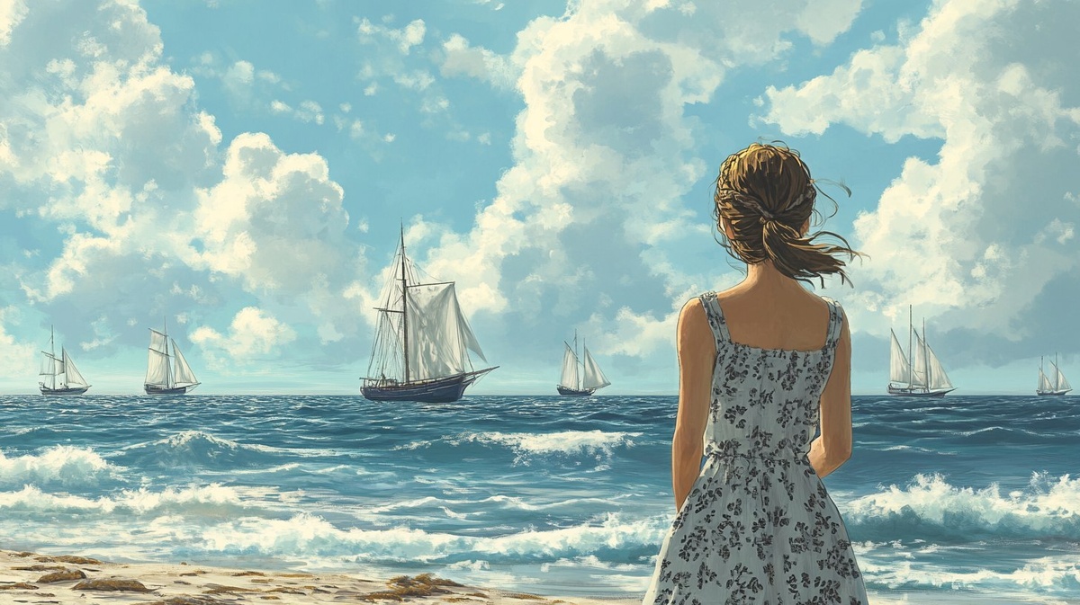 Создано на основе запроса: a young woman in her 20s with brown hair in a sundress standing on a beach near the water looking out into the ocean, their are sail boats and ships in the distance on the ocean, the weather is mid day and partly cloudy, studio ghibli style, --- Автоперевод: Молодая женщина в возрасте 20 лет с каштановыми волосами в сарафане, стоящей на пляже возле воды, глядя в океан, их парусные лодки и корабли на расстоянии на океане, погода в середине дня и частично облачный стиль студии Ghibli, Как тебе вариант? 🤔 https://dzen.ru/id/65c0c65c86e4f837c27b24d7 #ИИ #AI #нейросеть #midjourney #art