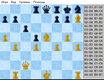 F2-F3 D7-D5 D2-D4 B8-C6 C2-C3 C8-F5 H2-H4 E7-E5 G2-G4 F5:B1 A1-B1 E5:D4 C3-D4 F8-D6 E2-E3 G8-E7 F3-F4 E8-G8 G4-G5 A8-C8 G1-F3 D6-B4 C1-D2 B4:D2 D1-D2 D8-D6 F3-E5 C6:D4 E3-D4 D6-E6 B2-B4 C7-C6 A2-A3 C8-D8 A3-A4 E7-G6 A4-A5 E6-E7 F1-D3 G6-H8 D2-C2 E7-E8