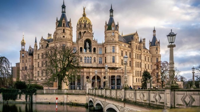 Окруженный Шверинским озером, замок Шверин (часто называемый Шверинским дворцом) находится в немецкой земле Мекленбург-Передняя Померания. Согласно историческим записям, замок на этом месте существовал с 973 года. Конечно, как и в случае со многими другими старинными замками, за прошедшие годы в него было внесено множество изменений.