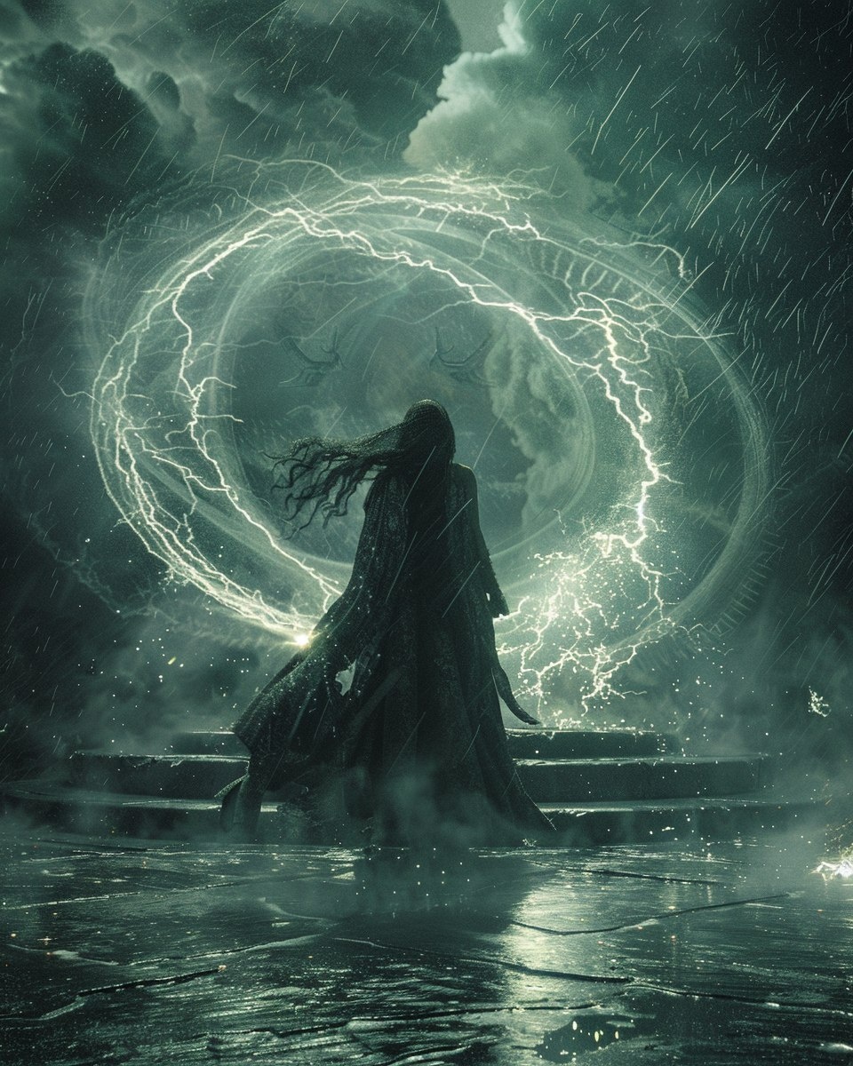 Создано на основе запроса: A sorceress standing at the center of a magic tempest, swirling storm clouds illuminated by arcane lightning, glowing runes spinning around her, torn cloak flapping violently, front view from low angle, wet stone ground reflecting spell light, cinematic lighting, hard contrast, texture details: wet fabric, stone, sparks, floating dust, 1080x1350, film grain, lens flare, scratches on lens, moody atmosphere