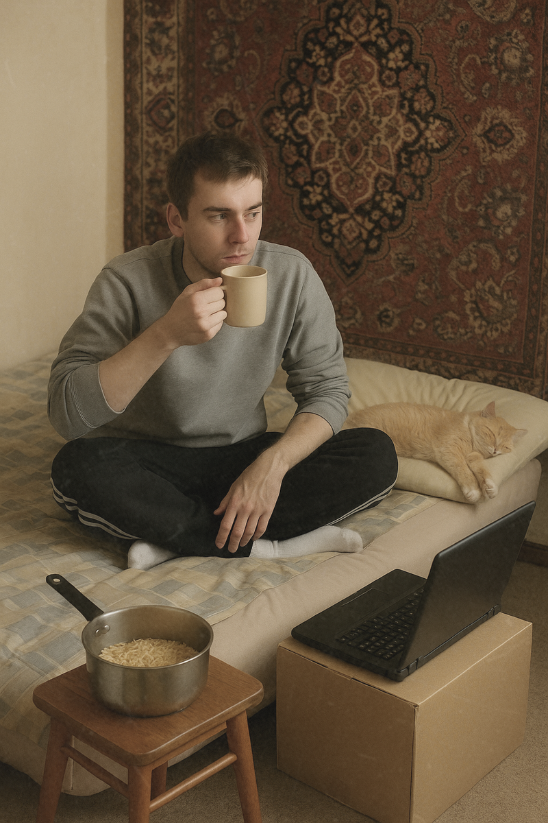 История одного заказа: 📺 Илья решил сохранить на память не просто момент, а целую маленькую вселенную — ту самую, где он и кот выживали как могли. Это была не квартира, а настоящий штаб выживания: ковёр на стене, матрас на полу, кастрюля с лапшой на табуретке, ноутбук на картонной коробке, и кот, который всегда занимал единственную подушку, будто знал, что он тут главный. — Это был наш бункер, — вспоминает Илья. — Место, где мы с котом держались друг за друга, где лапша была топливом, а вай-фай — окном в большой мир. Иногда казалось, что за этими стенами идёт какой-то апокалипсис, а мы — последние выжившие, вооружённые иронией и шерстью. Он попросил арт-дизайнера всё это как картинку из мема с собакой в огне — с юмором, крупными подписями, нарисованным шумом и атмосферой лёгкого... апокалипсиса... На картине Илья — в трениках, с кружкой «Гордость техникума», взгляд уставший, но с тем самым светом, который появляется только у тех, кто знает цену маленьким победам. Кот — в одеяле, как