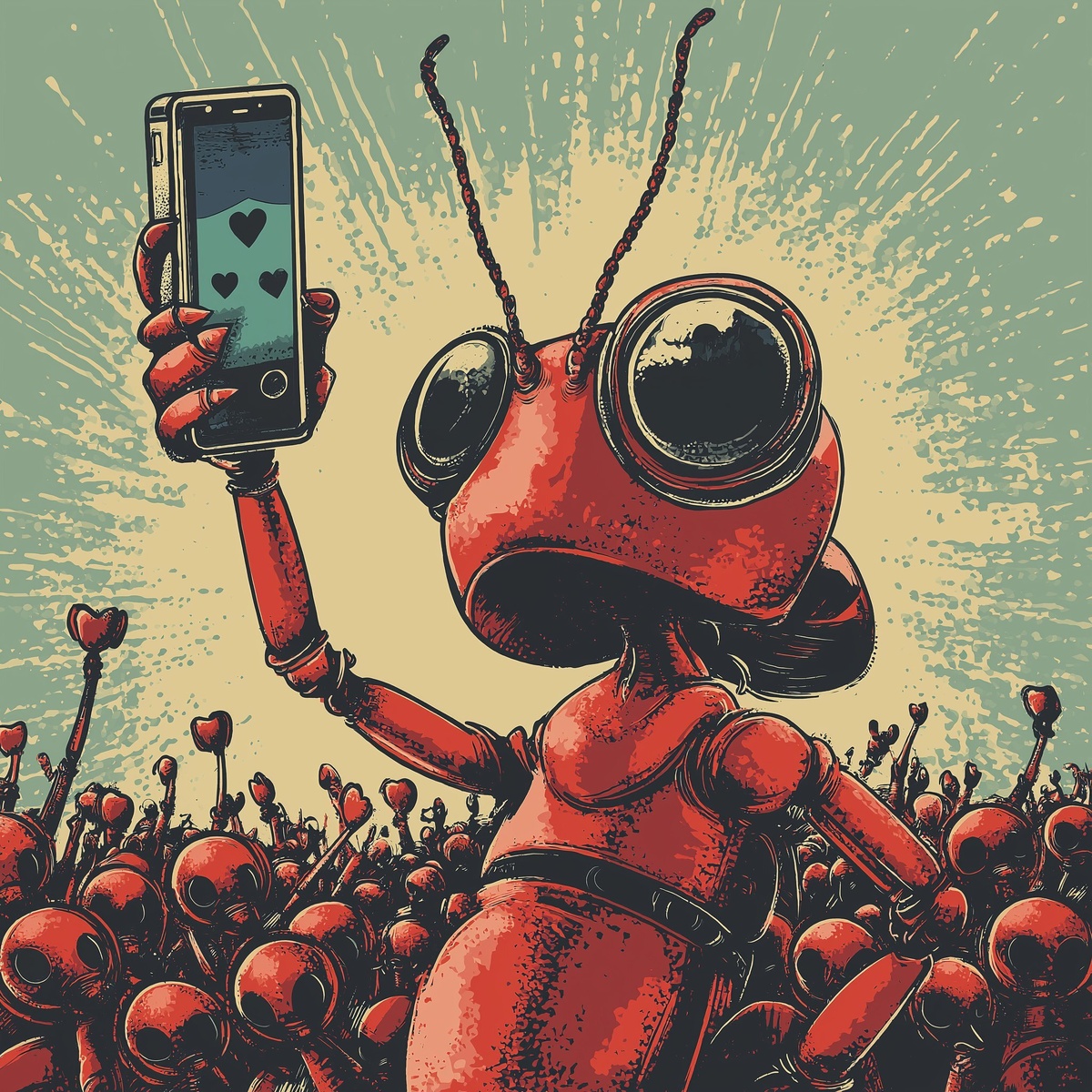 Создано на основе запроса: an ant holding up a cell phone in selfie mode, ant is in the style cartoon but with a similar look to banksy's monkeys, on the cell phone is a social app with millions of likes, on the bottom is a bunch of ants on their phones hitting like buttons. high res for printing. i'd like a pop art color scheme, with contrasting colors. --- Автоперевод: Муравей, удерживающий мобильный телефон в режиме селфи, Ant находится в мультфильме Style, но с аналогичным взглядом на обезьян Бэнкси на мобильном телефоне находится социальное приложение с миллионами лайков, внизу находится куча муравьев на своих телефонах, которые ударили как кнопки. Круто вышло? 🤔 https://dzen.ru/id/65c0c65c86e4f837c27b24d7 #ИИ #AI #нейросеть #midjourney #art