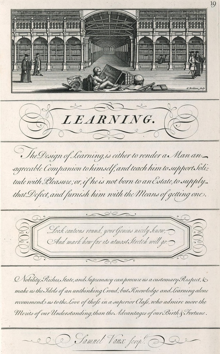 “Предназначение Образования – или сделать Человека приятным Компаньоном самому себе и научить его переносить Уединение с Удовольствием, или, если он не родился наследником Имения, исправить этот Недостаток и дать ему Средства приобрести его”. Это фраза из книги Джорджа Бикхэма Старшего “Универсальный Писарь” (The Universal Penman). Бикхэм (1684–1758) был каллиграфом и гравёром. С 1733 по 1741 год он собирал образцы каллиграфии 25 лондонских мастеров и публиковал гравюры с них (а также собственных надписей), которые делал вместе с сыном Джорджем. Полное название сборника – “Универсальный Писарь; или Искусство Письма, Сделанное Полезным для Джентльмена и Учёного, а также Делового Человека”. Его содержимое – образцы разнообразных документов и писем, нравоучения, цитаты из Библии и античных мыслителей, алфавиты ближневосточных языков. Страницы украшены интересными картинками. Например, обычай представлен двумя сценами – обрезанием и дуэлью. Обман – гадалкой, тирания – сожжением еретика при