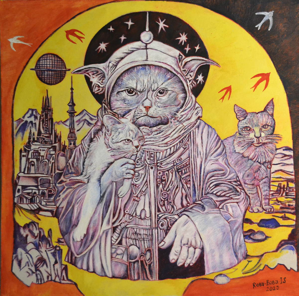 - **Фантастический элемент**: Главный персонаж — кот в космическом шлеме, что придаёт ему сказочную и научно-фантастическую атмосферу.