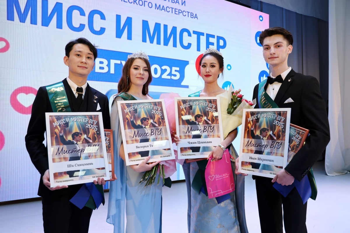 🕺💃24-го апреля в ВГУ имени П.М. Машерова состоялся Конкурс творчества и артистического мастерства «Мисс и Мистер ВГУ – 2025». 🏆По итогам конкурса обладательницами звания «Мисс ВГУ» стали Чжан Цзиньхан (ФОИГ) и Валерия Тишкова (ПФ). Титул «Мистер ВГУ» завоевали Ши Синьцюань (ФОИГ) и Иван Мирончик (ФМиИТ). 🟣«Первая Вице-мисс ВГУ» – Маргарита Олехнович (ФМиИТ); 🟢«Первый Вице-мистер ВГУ» – Иван Соболев (ХГФ); 🟣«Вторая Вице-мисс ВГУ» – Анастасия Зайцева (ФГЗиК); 🟢«Второй Вице-мистер ВГУ» – Антон Булыня (ЮФ). #новости #ТворчествоВГУ