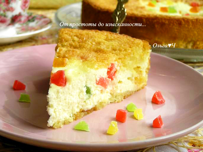 ванилин по вкусу Приготовление: Для теста яйца взбейте с сахаром, добавьте сметану и растопленное сливочное масло, еще взбейте. Добавьте муку с солью и разрыхлителем, перемешайте. Для начинки смешайте творог с яйцами, сахаром, манной крупой и ванилином. Добавьте нарезанные цукаты (часть оставьте для украшения), перемешайте. Выложите тесто в форму. Сверху выложите начинку, оставляя немного места по краям, посыпьте оставшимися цукатами. Выпекайте при 180*С около часа или до румяности. Приятного аппетита! Вам также могут понравиться: