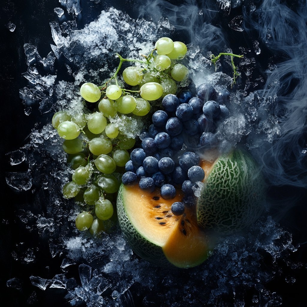 Создано на основе запроса: blue berries and hami melon and green grapes, shattered ice around, clean warm lighting, top view, black