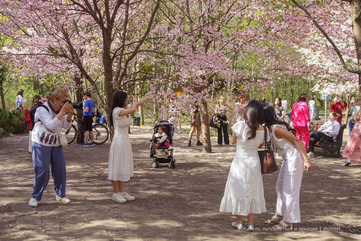 В Москве толпы людей приезжают полюбоваться заморским чудом — цветением сакуры. Я тоже решил съездить и посмотреть. Это действительно очень красиво! Сакура — это не один, а несколько видов деревьев. Чаще всего это вишня мелкопильчатая. Плоды несъедобные, а сами деревья декоративные. В Японии вокруг них целый культ. В Москве сакура тоже есть. Оттенки цветков на разных деревьях различаются, в основном, это нежно-розовый. Цветут деревья очень обильно. Красиво. Одно из популярных мест, куда приезжают смотреть на сакуру — Бирюлевский дендропарк. Сакура подарена жителям города Москва почетным гражданином города Южно-Сахалинска Мияниси Ютака в октябре 2010 года. Как видите, сакура прижилась. Это очень популярное место для фотографий, особенно у приверженцев японской культуры. Многие специально наряжаются в тематические одежды. Девушка в кимоно особенно поразила своим образом. Она даже обувь нашла соответствующую. Но так тут можно увидеть много самых разнообразных людей. Все хотят сфотограф