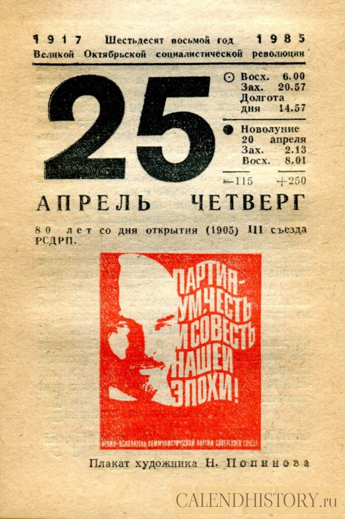 Итак, сегодня 25-го апреля и у нас на календаре 1985-й год. Перед нами листок советского календаря для женщин. На календаре у нас четверг - 25 апреля 1985-го года. 80 лет со дня открытия (1905) III съезда РСДРП. ПАРТИЯ — УМ, ЧЕСТЬ И СОВЕСТЬ НАШЕЙ ЭПОХИ!