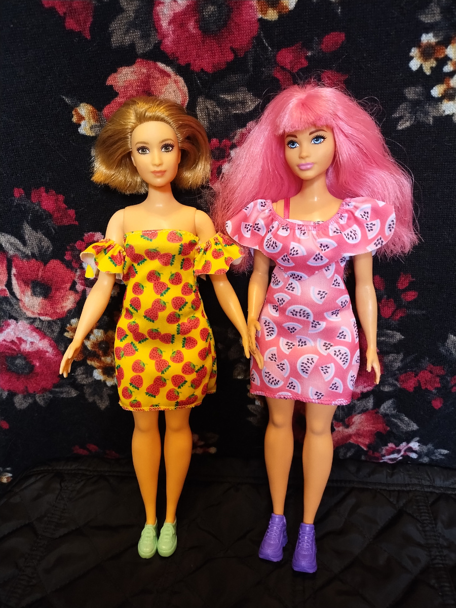 Всем доброго дня! Наконец у меня появились первые Барби с пышными формами, боди позитивные. Я очень хотела такую куклу, и вот у меня их появилось сразу несколько. Правда, не новые, не в упаковке, без одежды, поэтому я их одела по своему, выбрала платья с цветочным принтом, вернее, с фруктовым. Продолжая участие в разных челенжах нашего кукольного сообщества, - я решила этих двух кукол нарядить в платья с цветочным принтом. Вернее, с фруктовым. Вобщем, нарядные летние платья. И по моему, в этих платьях куклы выглядят очень привлекательно, платья им идут. Фотосессию снова сделала на разных фотофонах, чтобы сравнить где лучше. Вот куклы вместе, А теперь по отдельности. Первая куколка называется barbie Fashionistas #76 Curvy Caucasian doll, и выглядит она в первоначальном виде вот так Волосы у нее длинные, изначально, но ко мне попала уже не новая, кто-то волосы уже подрезал. Ну ничего, мне и так нравится, куколка очень симпатичная и милая. Сейчас у нее прическа что-то вроде ка