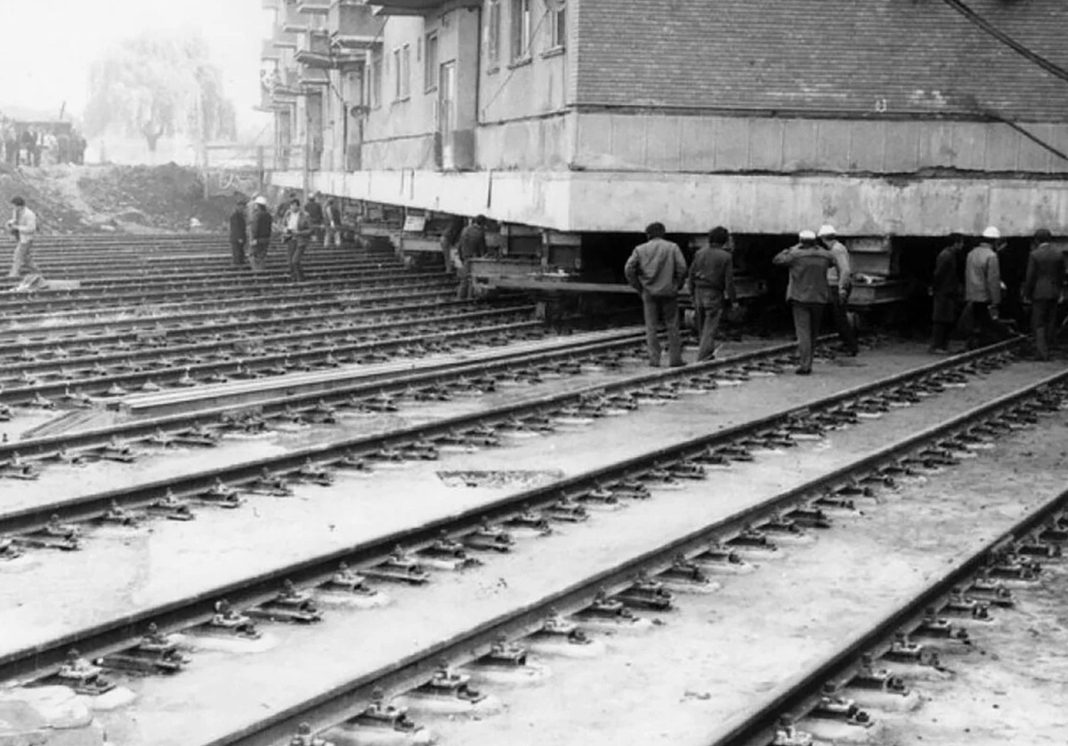 Дальше здание устанавливали на двутавровые балки, и с помощью лебёдок тянули вперёд. Иногда сзади помогали домкраты. Всё движение было медленным, аккуратным. Главное — не спешить и не ошибиться. Один не тот наклон — и можно остаться без стены.